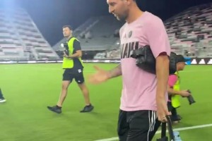 神情轻松!梅西赛前踩场时向场边球迷微笑致意~