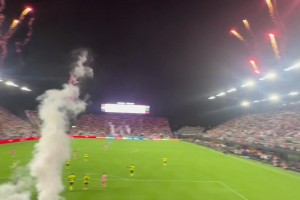 放烟花庆祝!现场球迷视角拍摄梅西头球冲顶破门!
