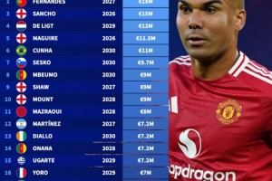 体育资讯8月24日讯 德转盘点了曼联球员年薪榜单,其中卡塞米罗2100万欧居首,桑乔1500万欧第三,具体如下(合同到期时间+年薪):