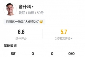 体育资讯8月25日讯 2025-26赛季英超第2轮,曼联客场1-1富勒姆。舍什科替补出战,多项数据挂零,只有2次争顶均成功。