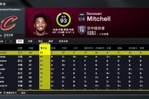 米切尔93是队内最高,小莫布里89排在第二,加兰87、阿伦84分列第三、第四,亨特80排第五。