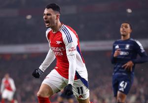 阿森纳首发:1-拉亚、2-萨利巴、6-加布里埃尔、12-廷伯、33-卡拉菲奥里、23-梅里诺、41-赖斯、36-苏维门迪、11-马丁内利、20-马杜埃凯、14-约克雷斯