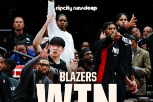 开拓者官方晒赢球海报:利拉德&杨瀚森入镜 替补席众将庆祝