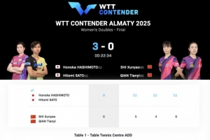 在女双决赛中,桥本帆乃香/佐藤瞳3-0轻取石洵瑶/钱天一,具体比分为11-5、11-4、11-6。