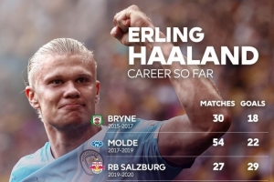 体育资讯9月11日讯 英超官方统计了哈兰德职业生涯至今进球的分布,并晒出数据图片,哈兰德在曼城149场127球,在挪威队45场48球。