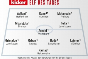 中场:姆班古拉(云达不莱梅)、马克西利安-阿诺德(沃尔夫斯堡)、内森-泰拉(勒沃库森)