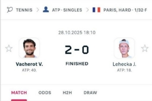 瓦舍罗2-0横扫莱赫卡,将在巴黎大师赛次轮再战表哥林德克内希