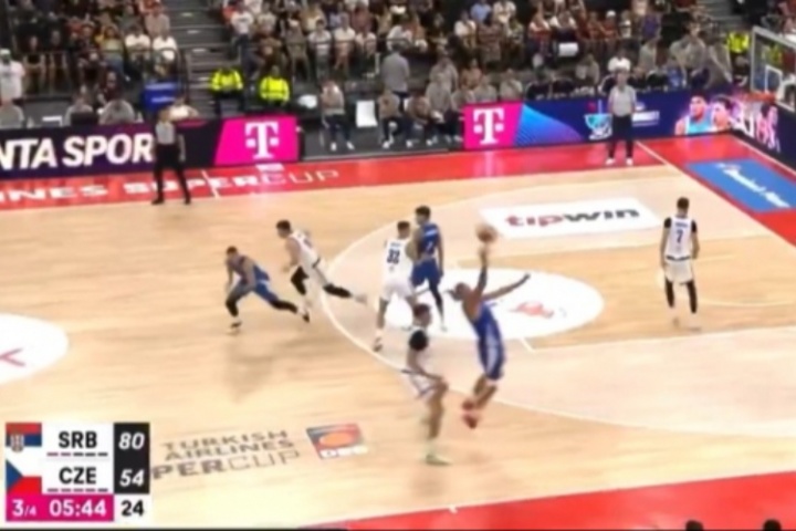 约维奇底线发球,约基奇接应右手单手将球往后一甩,妙传阿夫拉莫维奇。