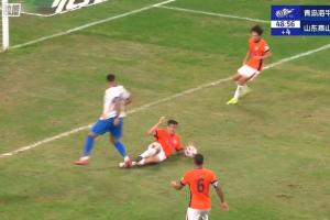 VAR沈寅豪介入,主裁判王迪看过回放后认定刘军帅手球犯规,判给泰山点球。