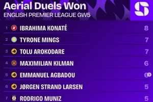 体育资讯9月24日讯 英超第5轮战罢,squawkafootball列各项数据排行,利物浦中卫科纳特是本轮赢得争顶最多的球员,共计8次。