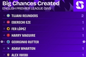 体育资讯9月24日讯 英超第5轮战罢,squawkafootball列各项数据排行,赖因德斯共创造2次重大机会,本轮最多。
