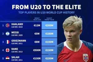 1.哈兰德(2019年参加U20世界杯):1200万欧元(参加U20世界杯时的身价)→2亿欧元(生涯迄今最高身价)