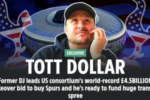体育资讯09月26日讯 太阳报独家报道,一家美国财团计划以创世界纪录的45亿英镑总报价买托特纳姆热刺。