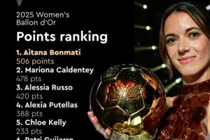 体育资讯09月27日讯 《法国足球》公布金球奖各排名得分情况,女足方面,邦马蒂以506分夺得金球奖,领先第二的卡尔登泰28分。