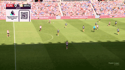 比赛第61分钟,阿德雷特长传吊入禁区,梅恩达头球破门,桑德兰1-0领先西汉姆联!