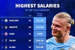五大联赛年薪排名:哈兰德3170万欧居首,姆巴佩、凯恩二三位