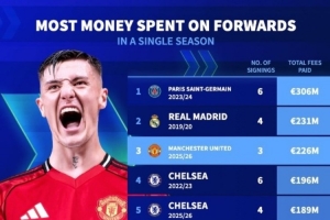 体育资讯8月11日讯 德转统计了单一赛季锋线引援费用榜单,曼联今夏花2.26亿欧引进3人排在第三位,巴黎、皇马前二。