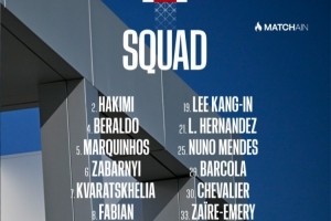 后卫:2-阿什拉夫、4-贝拉尔多、5-马尔基尼奥斯、6-扎巴尔尼、21-卢卡斯-埃尔南德斯、25-努诺-门德斯、51-帕乔
