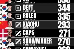体育资讯10月4日讯 今日有外媒统计了S赛正赛选手击杀数: