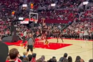 GIF-开拓者后卫单手欲挑战杨瀚森,被小杨直接大帽