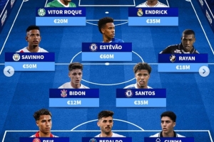 体育资讯10月12日讯 德转列出巴西U21最贵阵,埃斯特旺6000万欧最高,罗克和恩德里克突前,萨维尼奥在列,全队总身价3.01亿欧。