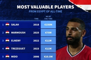 体育资讯10月13日讯 德国转会市场列出埃及球员历史最高身价排名,萨拉赫1.5亿欧居首,马尔穆什7500万欧次席。