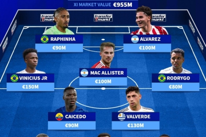 体育资讯10月16日讯 德转盘点了南美足联球员的最高身价阵容,整套阵容总价值高达9.55亿欧元。其中皇马边锋维尼修斯以1.5亿欧元成为身价最高的球员,巴尔韦德以1.3亿欧元紧随其后。