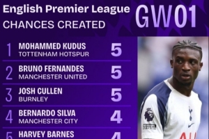 体育资讯8月20日讯 新赛季英超首轮比赛已经结束了全部争夺,根据Squawka的数据统计,库杜斯、布鲁诺-费尔南德斯以及约什-库伦并列创造机会最多球员。值得一提是,库杜斯首次在英超中单场送出两次助攻。