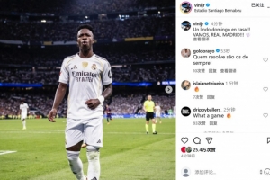维尼修斯社媒晒庆祝照:主场度过美好的周日,皇马加油!