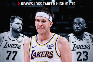 此役,里夫斯出战39分钟,22投12中,三分球10中6,22罚21中爆砍生涯新高的51分外加11板9助2断,正负值高达+22。