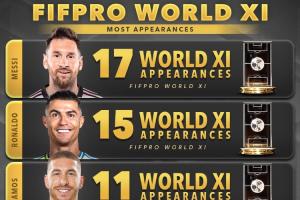 两座大山!38岁梅西17次、40岁C罗15次入选年度最佳阵,排在前二