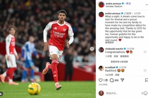 阿森纳小将安努斯社媒庆祝首秀:我和家人都很自豪,感恩这次机会