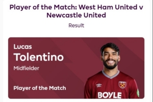 打进世界波,官方:帕奎塔当选西汉姆联vs纽卡全场最佳球员