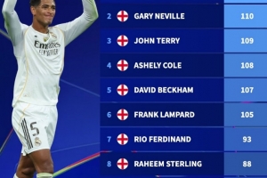 英格兰球员欧冠出场次数榜:斯科尔斯124场居首,贝林50场第28