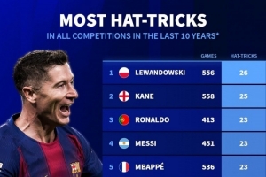 近10年前十联赛戴帽次数排名:莱万26次居首,凯恩25次、梅罗23次