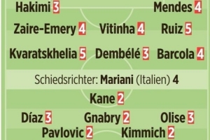 图片报评分:孔帕尼、诺伊尔1分、迪亚斯3分,马金6分、主裁4分
