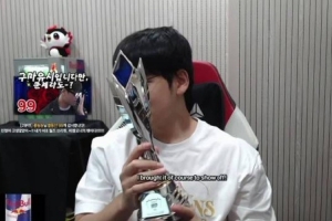 真是爽到了Gumayusi在直播间向粉丝们多角度展示FMVP奖杯